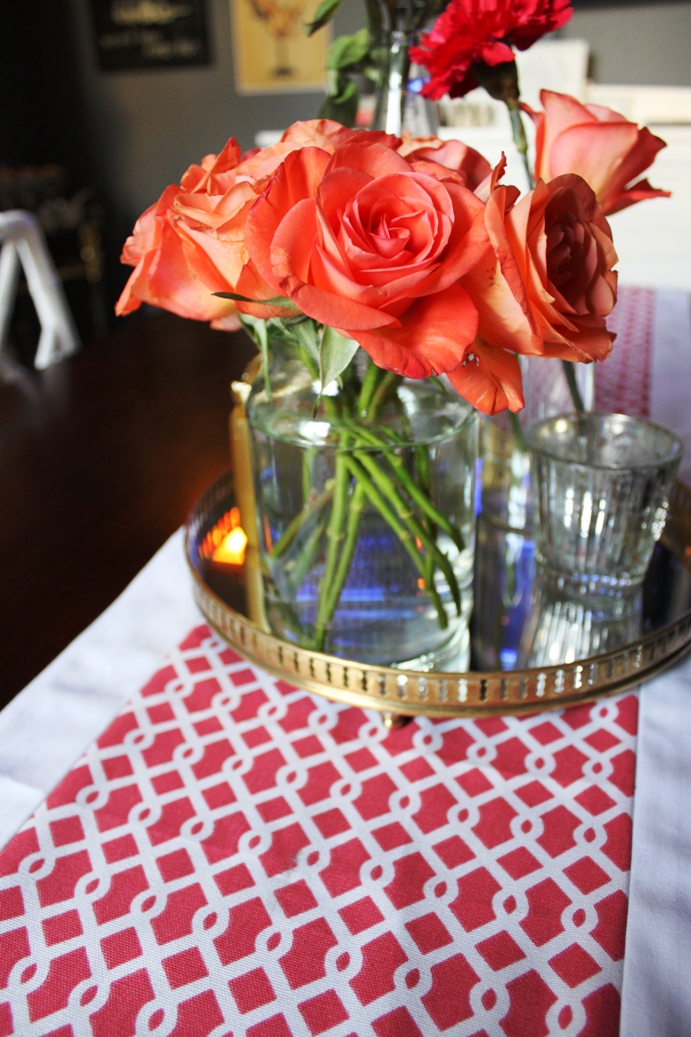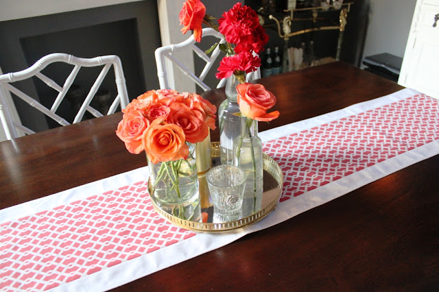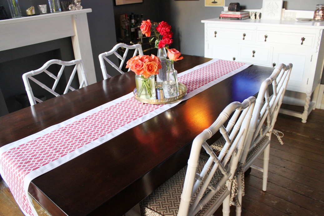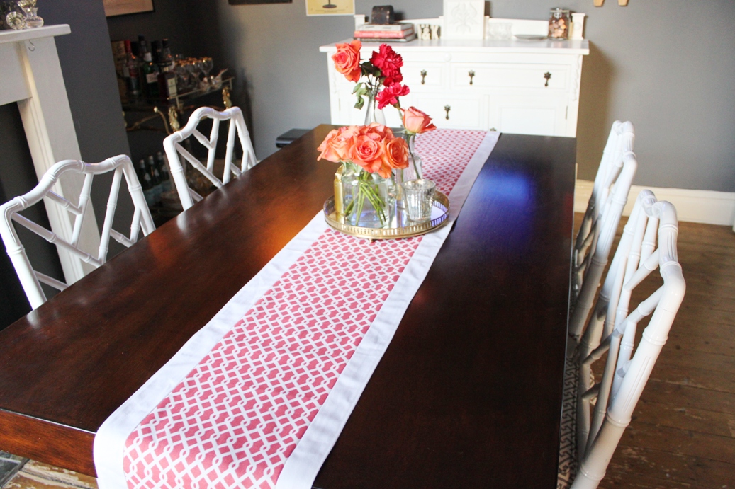 In the meantime, with a bit of excess fabric that I had leftover, I decided to create a table runner for the dining table.Β I swear I am messing with the dining room every other week but I love that the room is so easily changed up.Β And as I have the attention span of a 4 year old, that suits me fine.