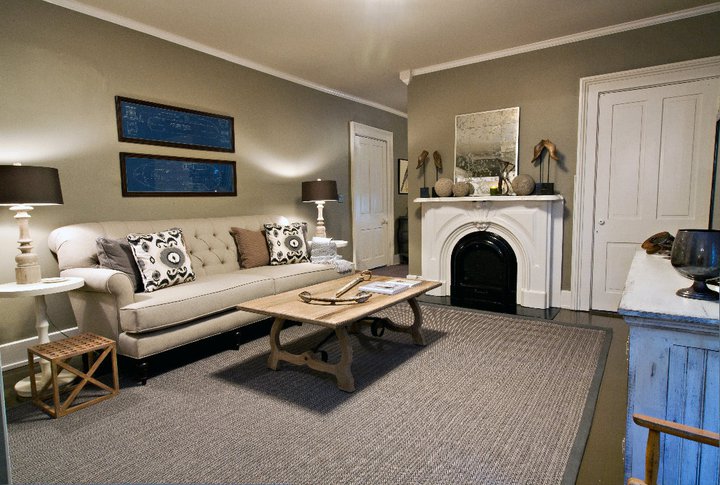 On the mantle we have displayed a collection of vintage shoe forms β and antique ship blueprints hang over the linen tufted sofa. The wooden balustrade lamps are from Arteriors. The wall color in both spaces is Raccoon Hollow by Benjamin Moore.