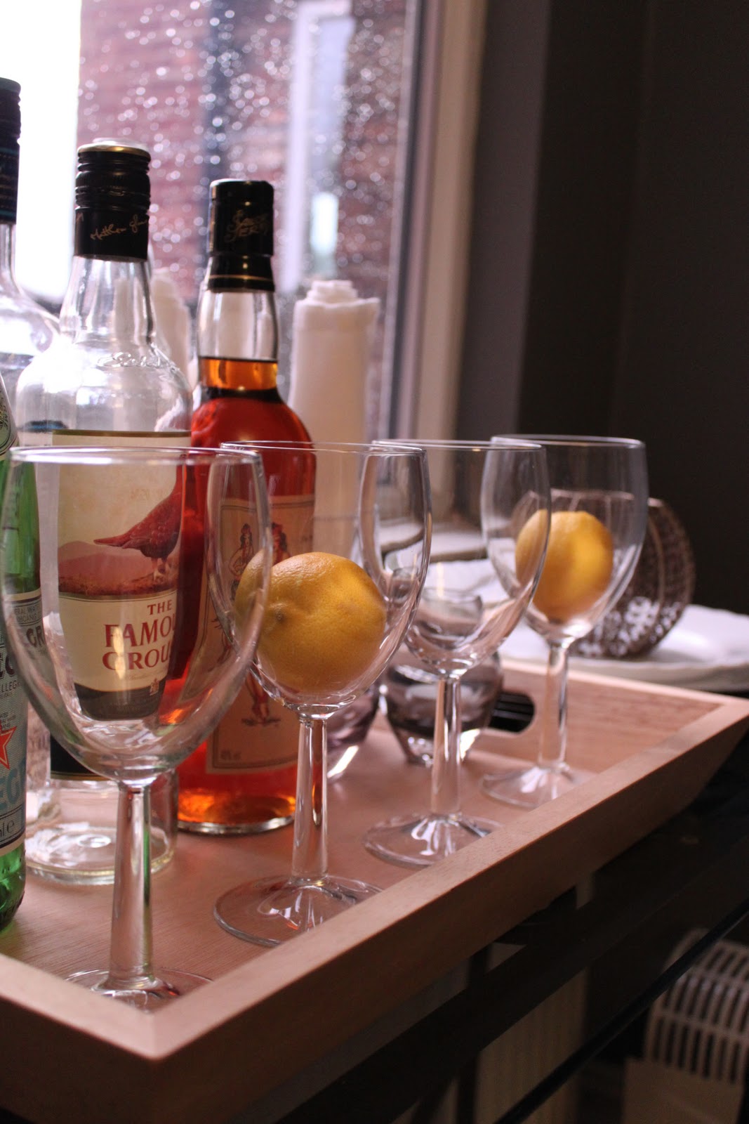 So what about the little glass console table?Β  Well it’s been repurposed at the moment as a sort of drinks station until I get my proper one.Β  What do you think?Β  (I know the bottles are mostly empty, what can I say, we like a drink…)