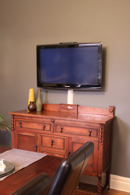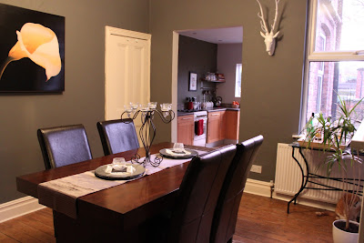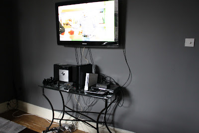 But what you haven’t seen is how bad the wall to the right of the fireplace actually looked.Β  I’ve spoken before of our reasoning for having a large LCD television in the dining room and my plans for creating a gallery wall.Β  However, prior to bringing home the sideboard, we had the most inappropriate glass console table we were using to house the stereo, the remote controls, two games consoles and countless other paraphenalia including an absolute MESS of leads.