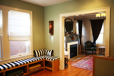 | How lovely does it look with the olive green and the more modern striped window seat? |