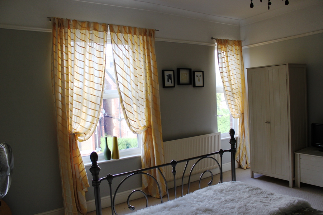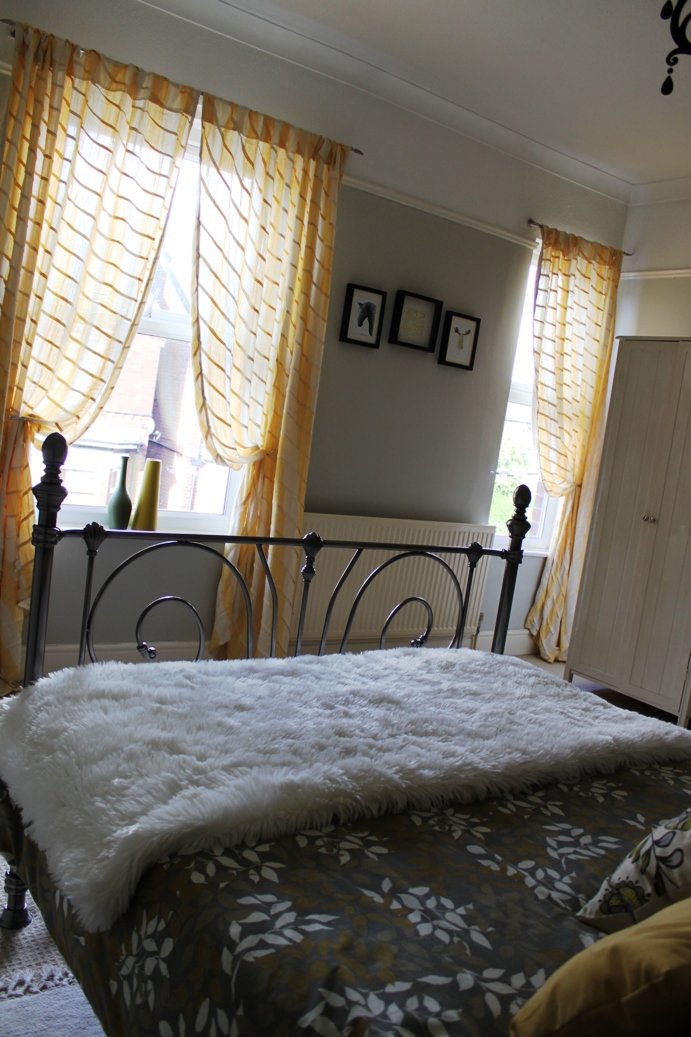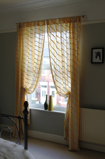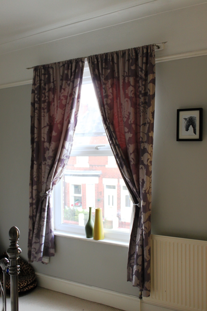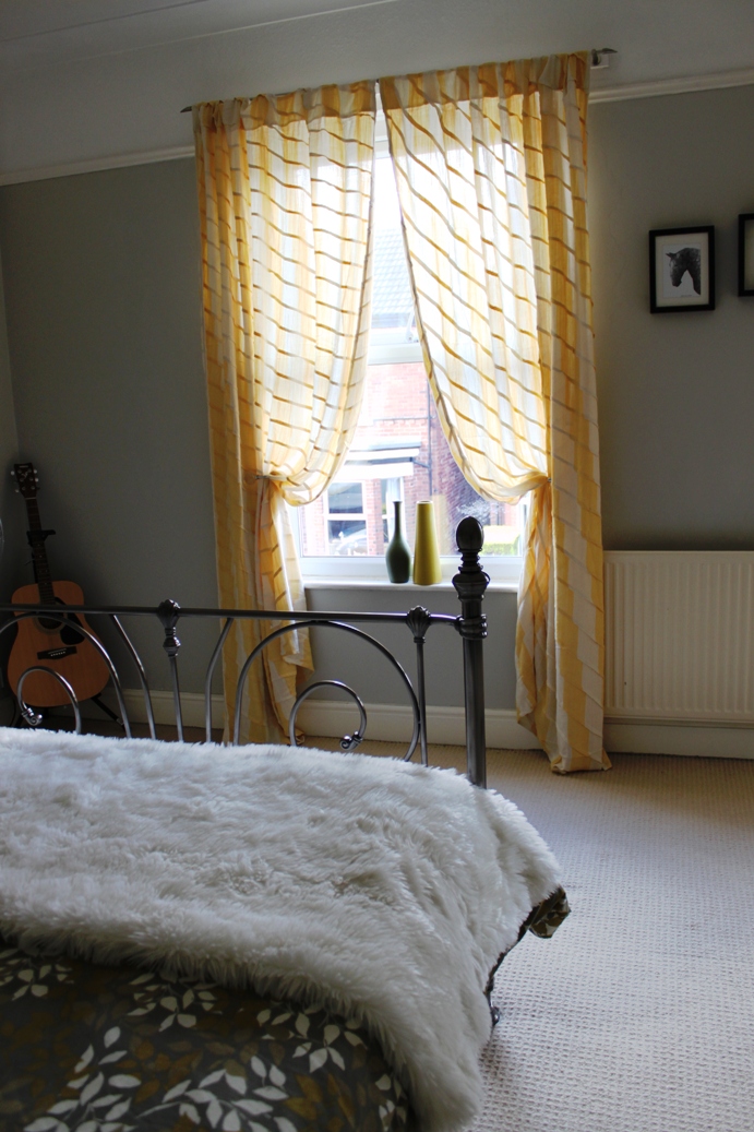 Yeah, seriously.Β Curtains from my last bedroom in plumb-lilac that went with absolutely nothing inΒ our yellow, grey and olive bedroom colour scheme.Β Plus, they were so ridiculously short, I’m sure all the other curtains on the street were laughing at them behind their backs.Β Poor sad curtains.Β They really deserved better.Β As did the windows.