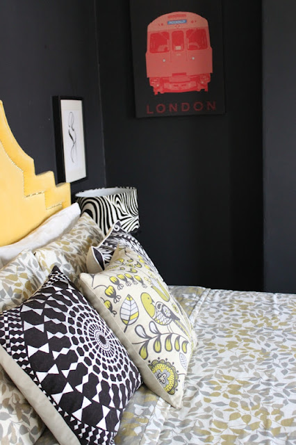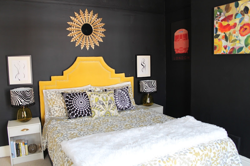 Wow, wow, wow! I love the headboard and the entire room. I've been contemplating dark walls in our bedroom and yours is perfect. Great work!
