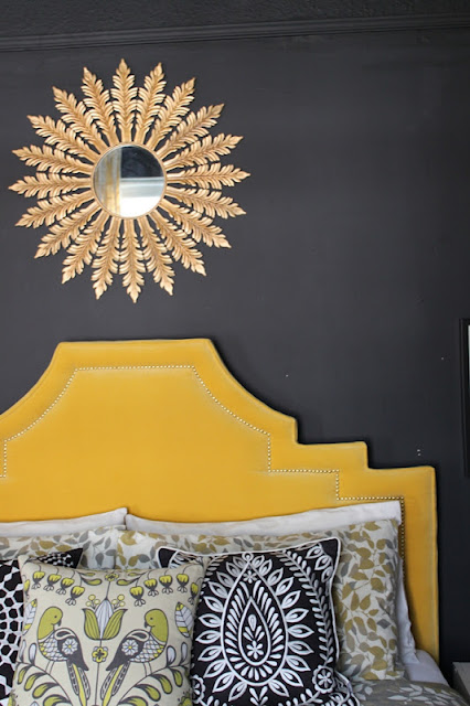 Well it's about time that lovely yellowy velvety gorgeousness made its way to your bedroom! Love the shape, the color, the nailheads, and the velvet. I am so excited for you that it's finally here! Now quit humping your headboard and get going on the rest of that room. It's coming along!