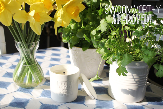 I always know when it’s spring in my home because I can finally buy fresh herbs for my windowsill and they don’t die on me!Β I used to only pot my herbs in my little silver buckets but they were starting to look a little sad and old so I swapped them out for a couple of small white plant pots I wasn’t using.Β I love how fresh they look with the burst of green from basil and parsley and they look lovely along with the new candle.