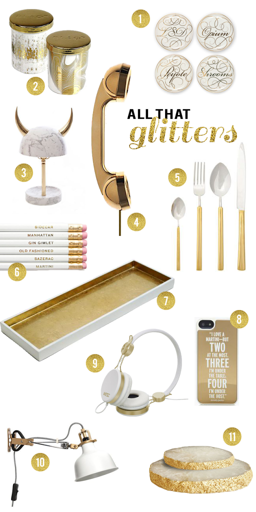 So in my last post, I talked about being drawn to the simple glamour of white and gold. In my travels, I have actually picked up a few bits and pieces to satiate my need for this clean and sparkly palette – a gold and white headset to listen to tunes while I work (currently on sale!), a gold leaf and lacquer tray to hold cosmetics in my dressing room, a phone handle that plugs into your mobile to chat comfortably and a set of white pencils with gold writing that I hope will look rather smart in my future office (yep, I’m already starting to buy stuff to go in the office I don’t even have yet.. but when I got an itch, I gotta scratch.)